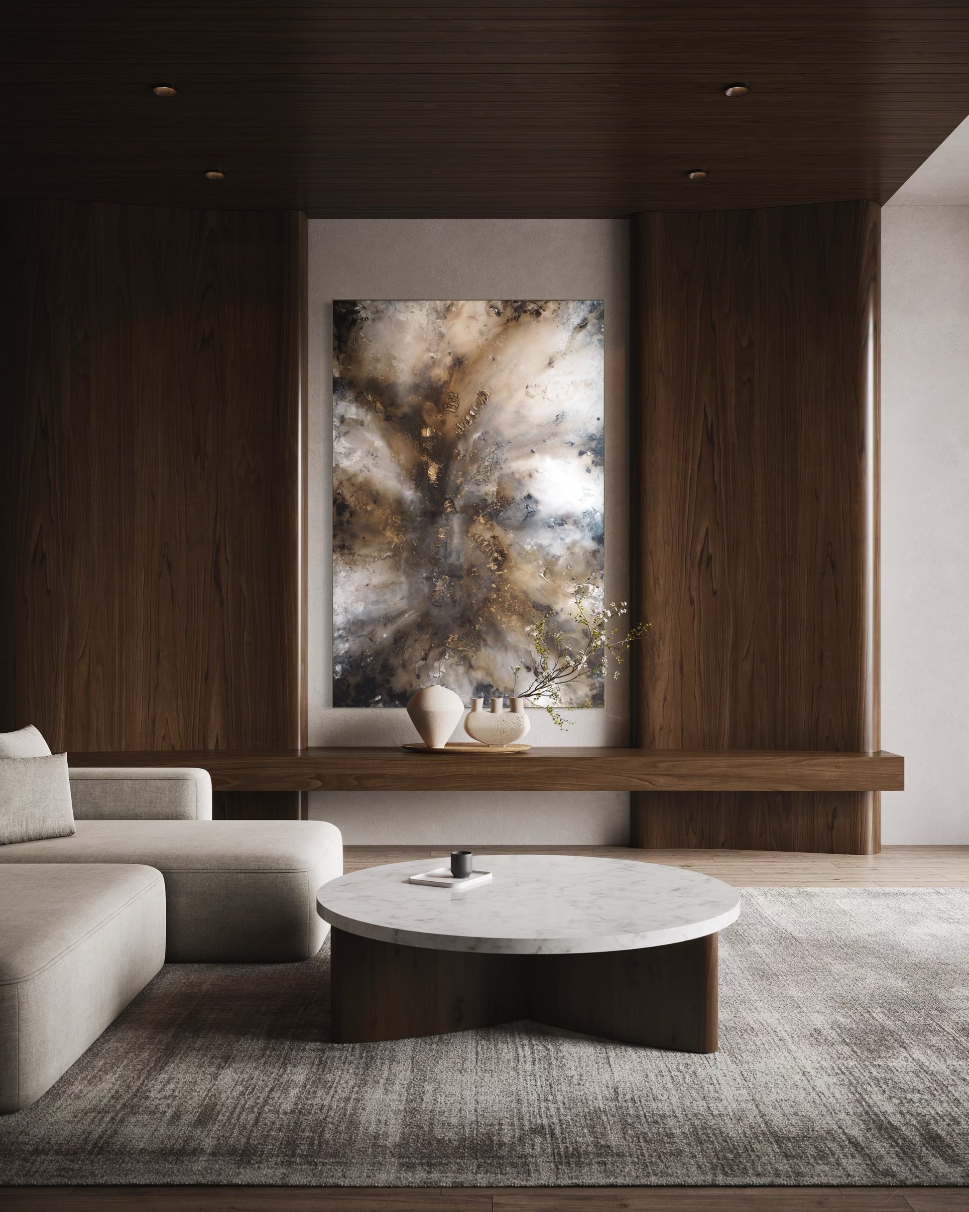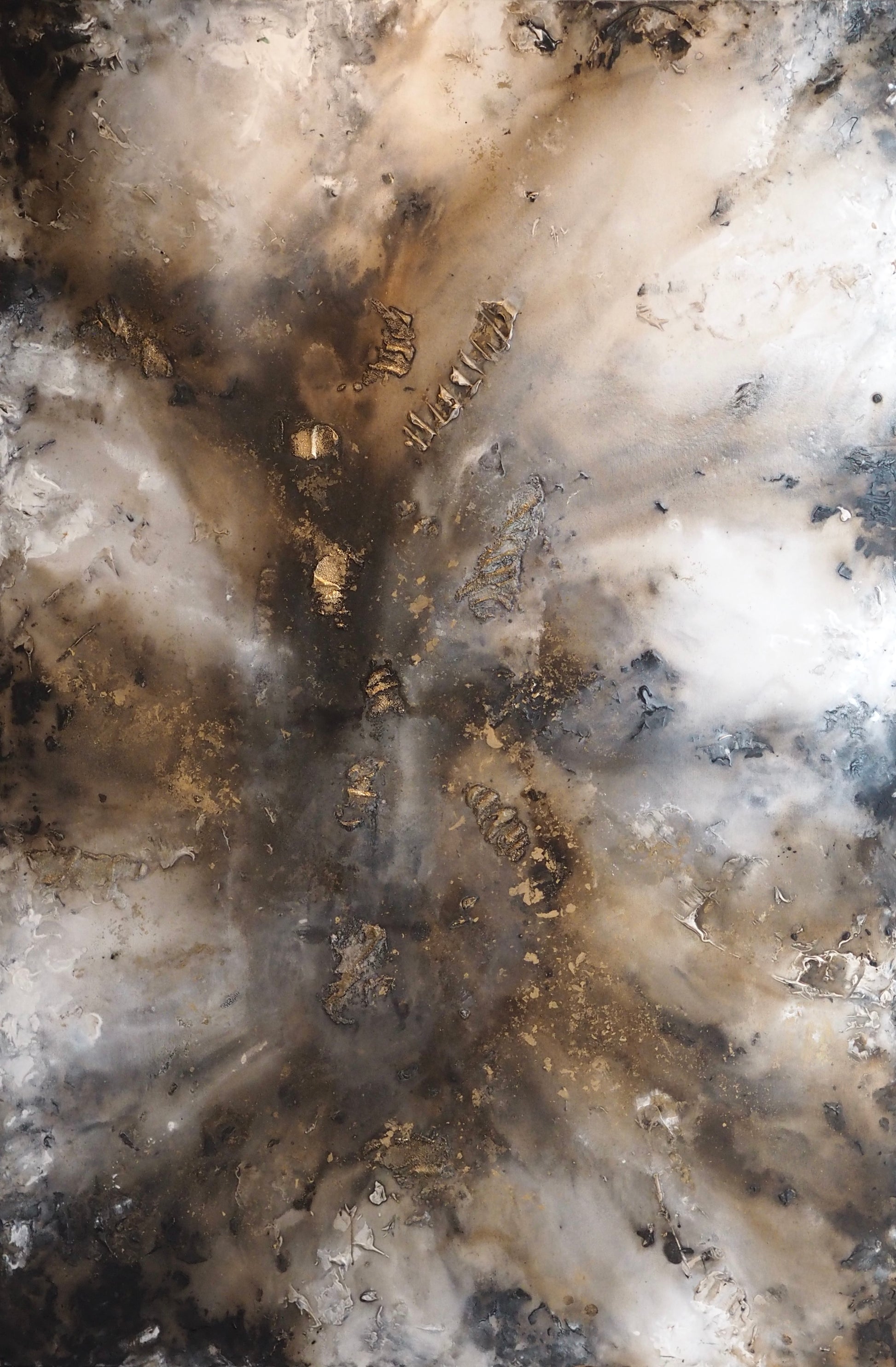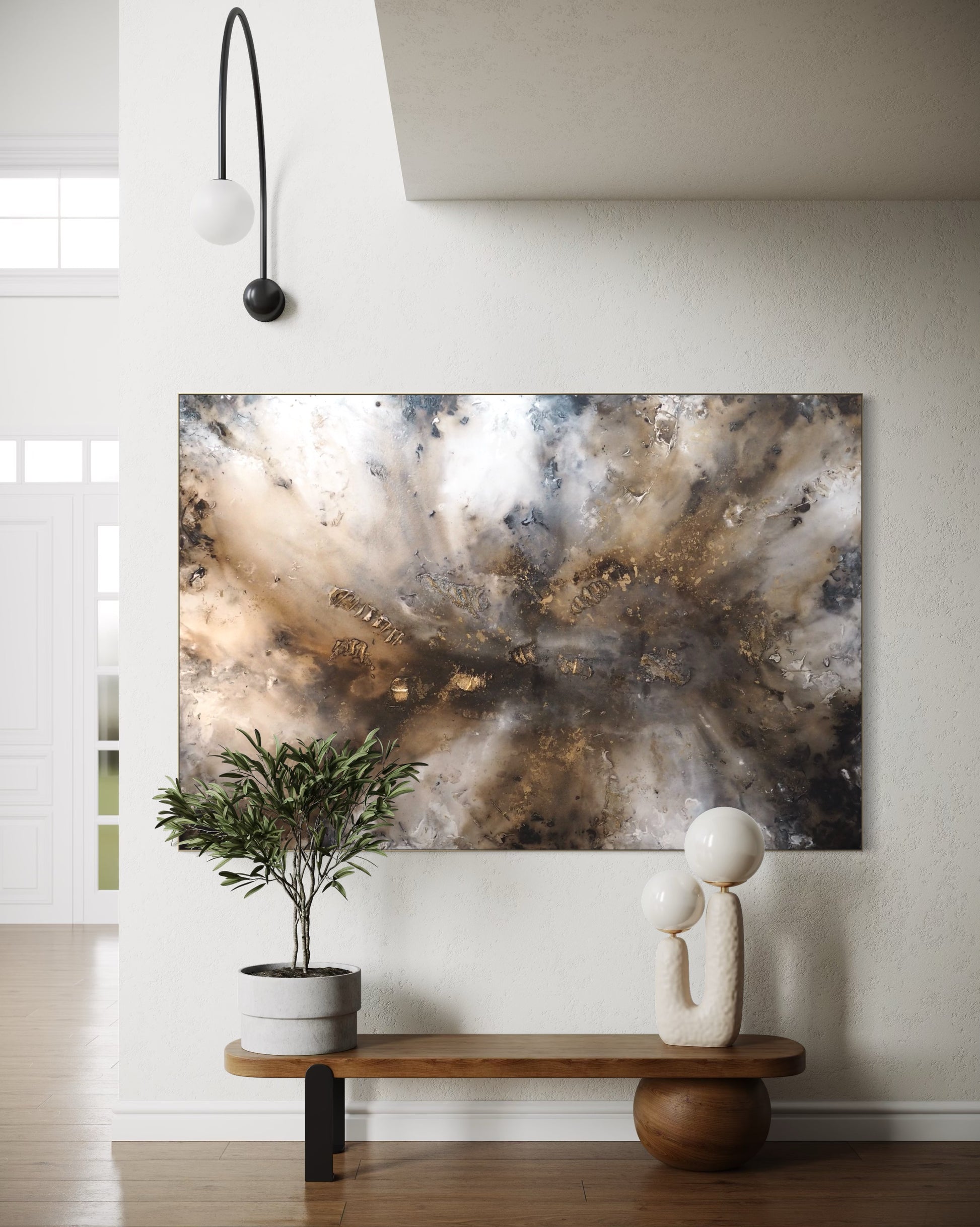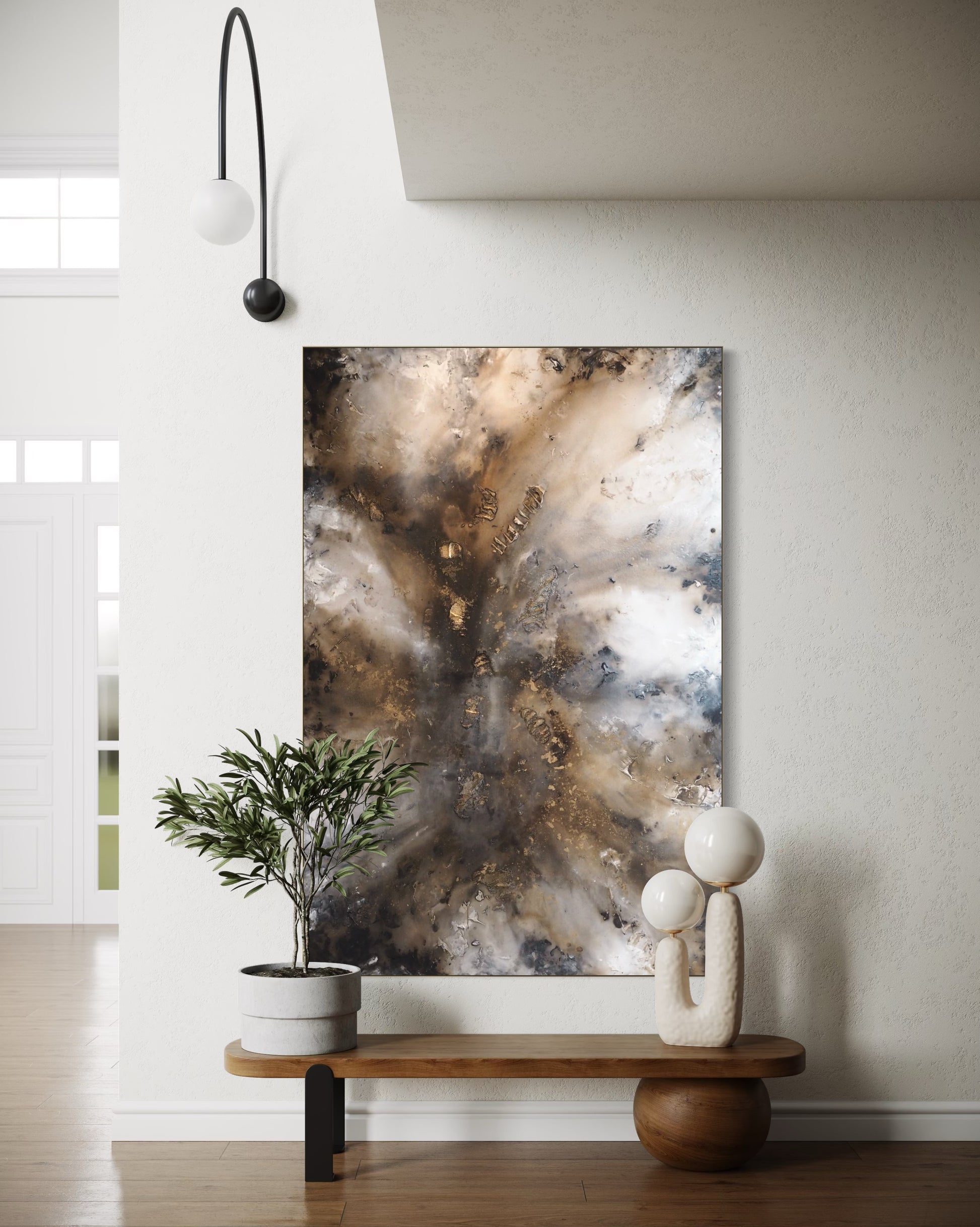 Denna målning fångar ett djupt och varmt intryck, målad i bruna, beiga och jordnära toner som inspirerats av naturens rika jordnära palett. Med sina rika färgnyanser och organiska former skapar verket en harmonisk koppling mellan det kraftfulla och den lugna naturen. Målningen inbjuder betraktaren att utforska de mystiska djupen av naturen och upptäcka dess dolda skatter.