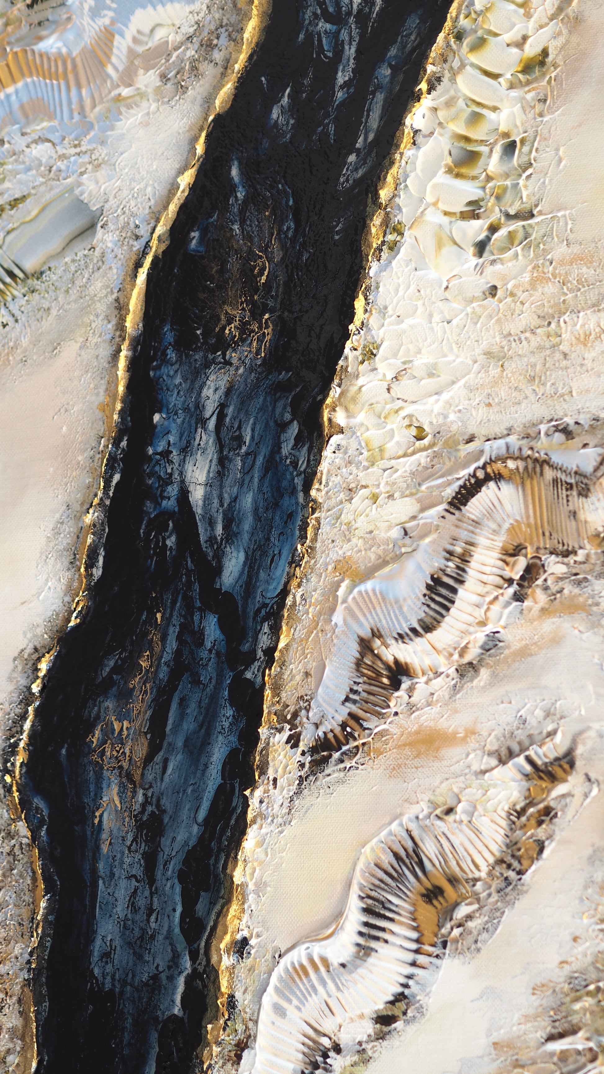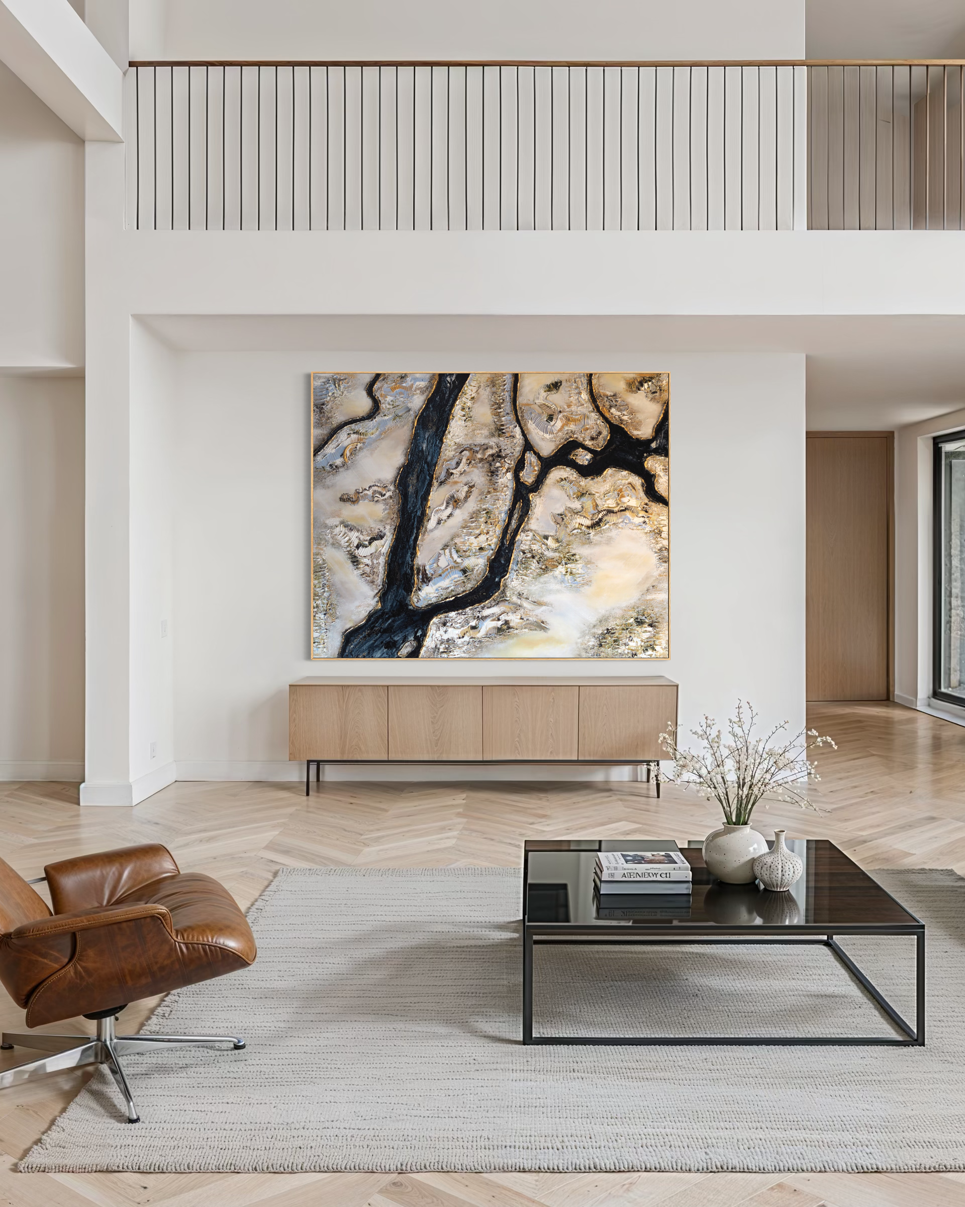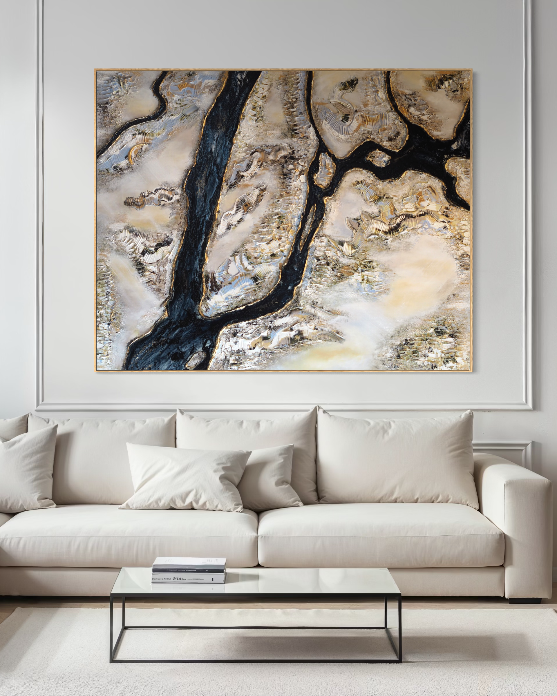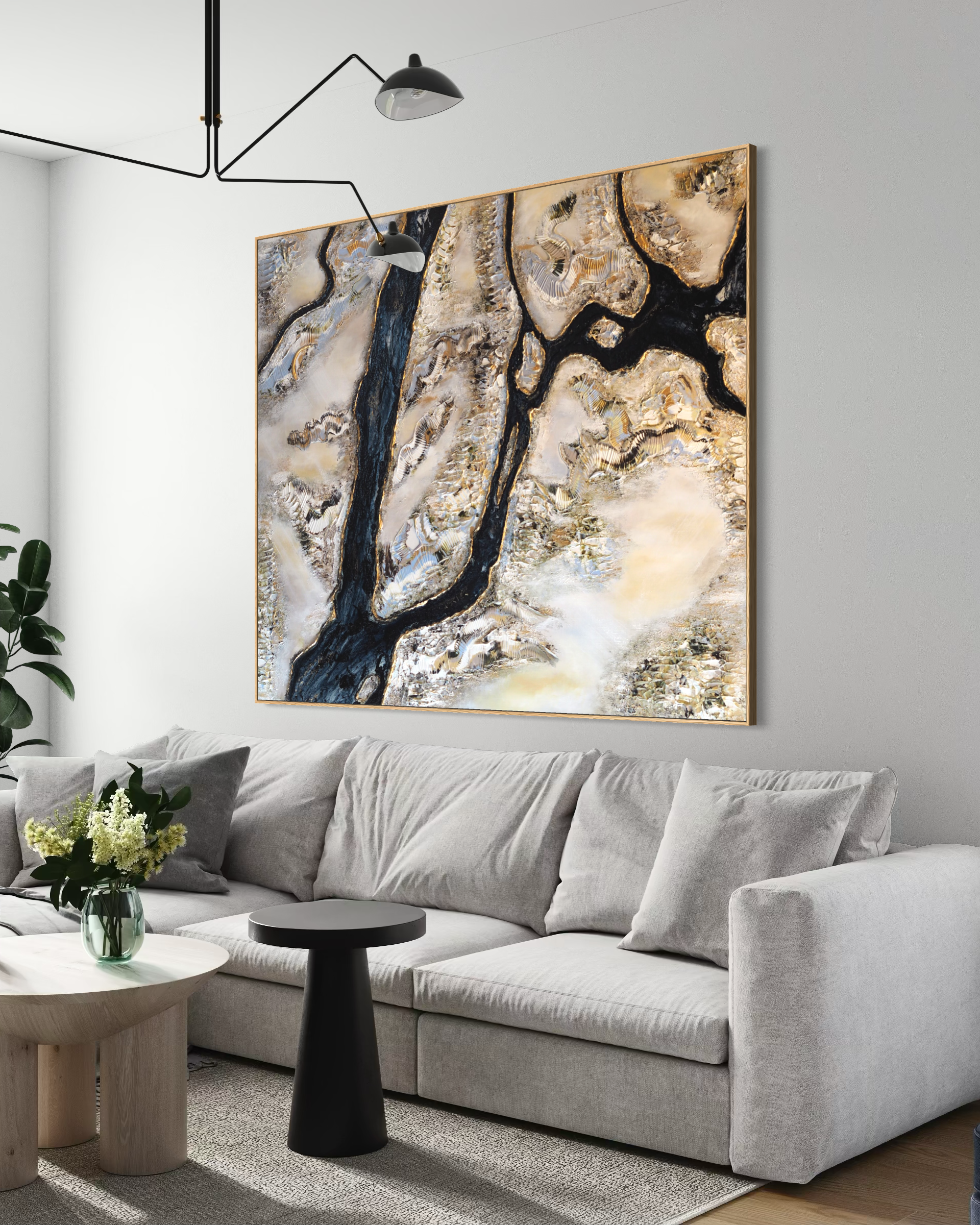 Målningen skildrar New York sett ur ett fågelperspektiv, där stadens konturer och närheten till Hudson och East River framträder i ett harmoniskt uttryck. Perspektivet ovanifrån skapar en känsla av överblick, där arkitektur, vatten och ljus smälter samman i en helhet. Genom lager av akryl och oljefärg, med mjuka övergångar och levande strukturer, byggs verket successivt upp.