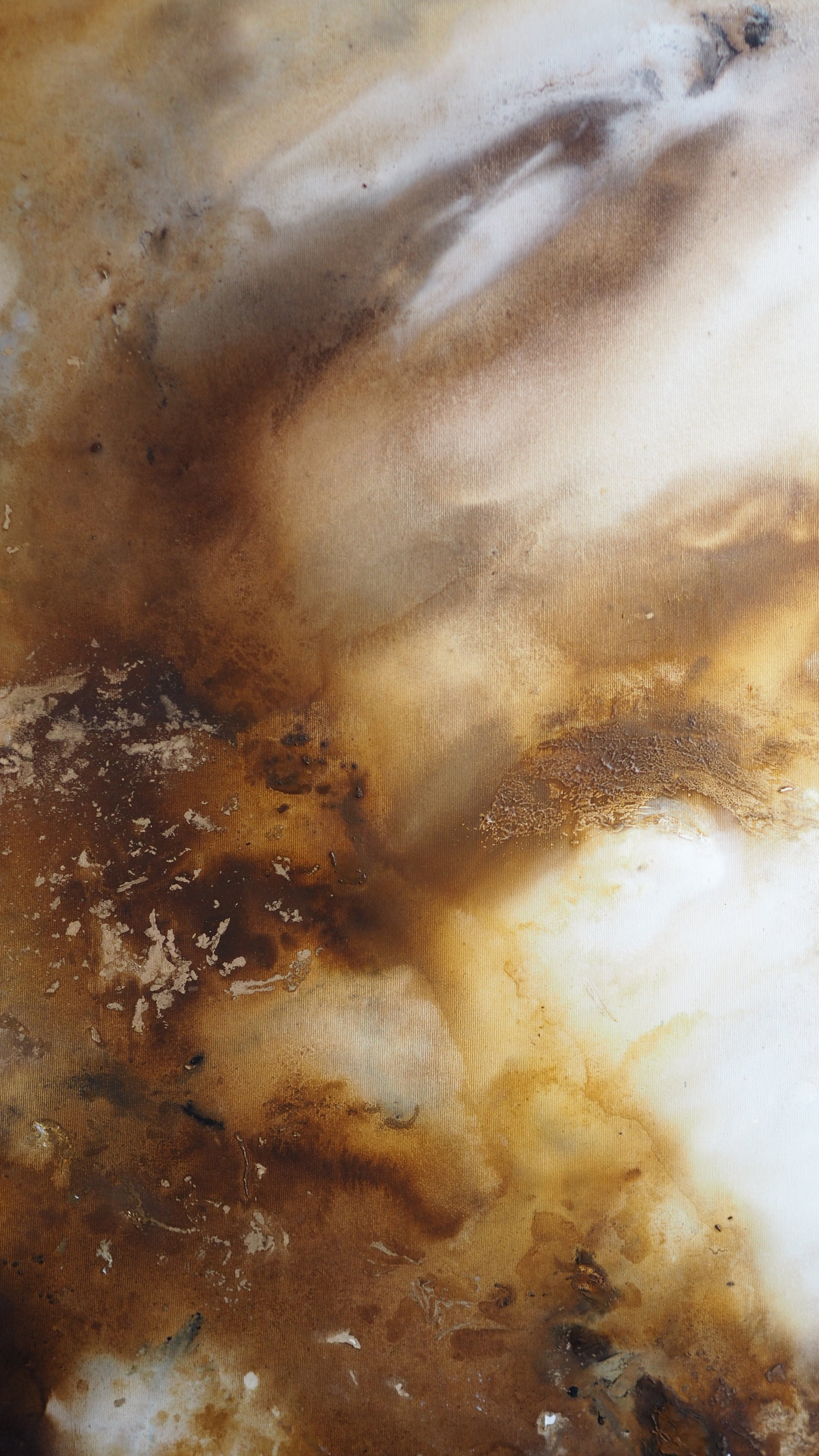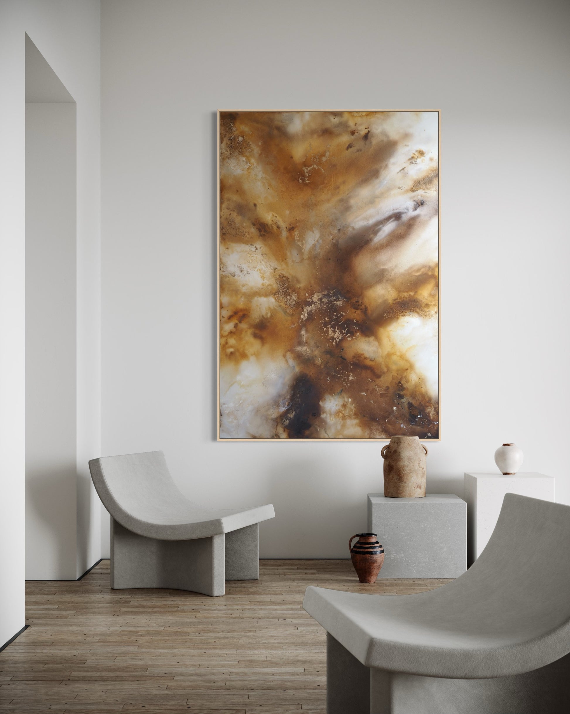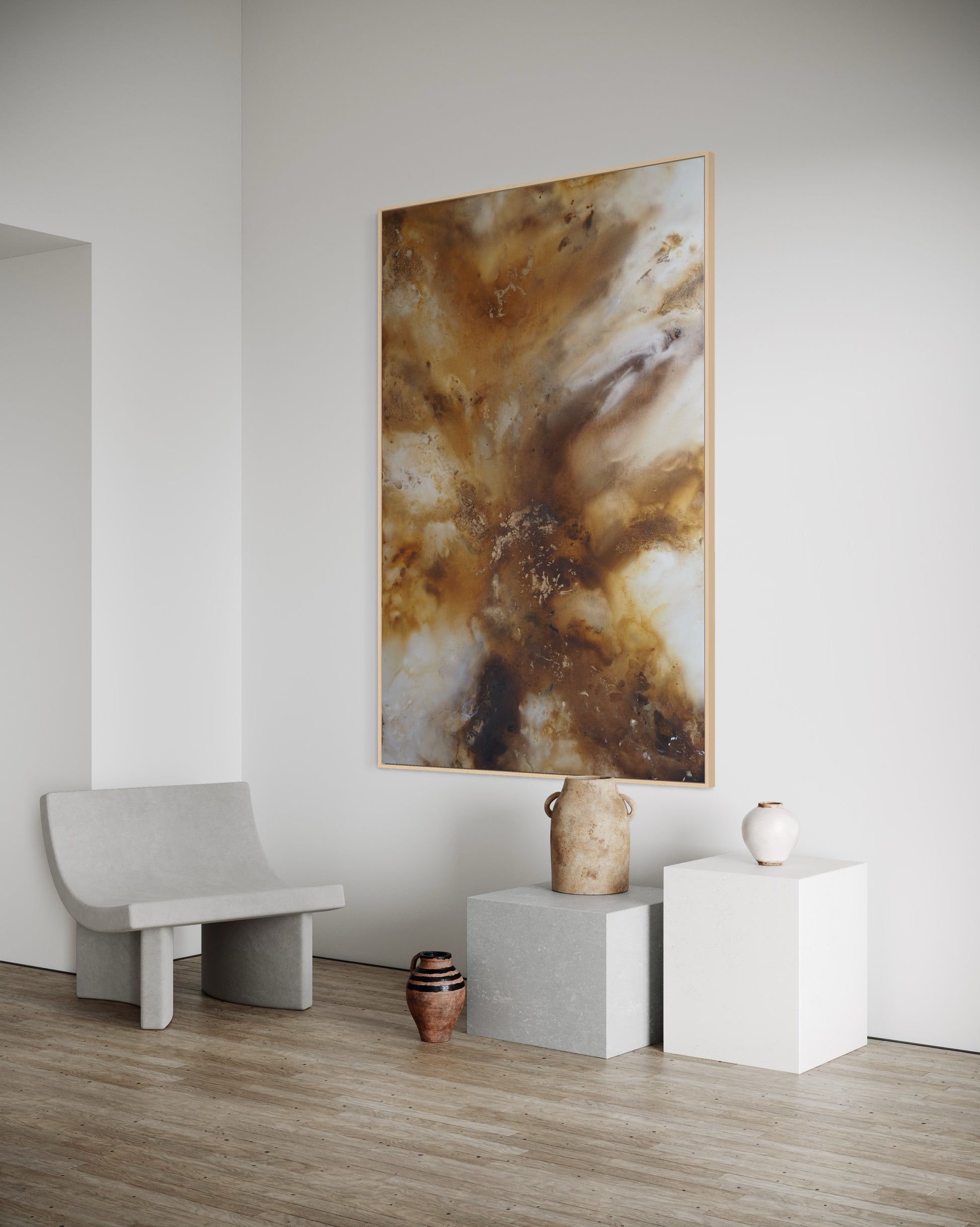 Terrakotta är ett lugnt verk i rostfärgade toner inspirerat av naturens varma jordnyanser. Genom mjuka övergångar med olja förmedlar målningen en stilla värme och närhet till naturens hjärta.